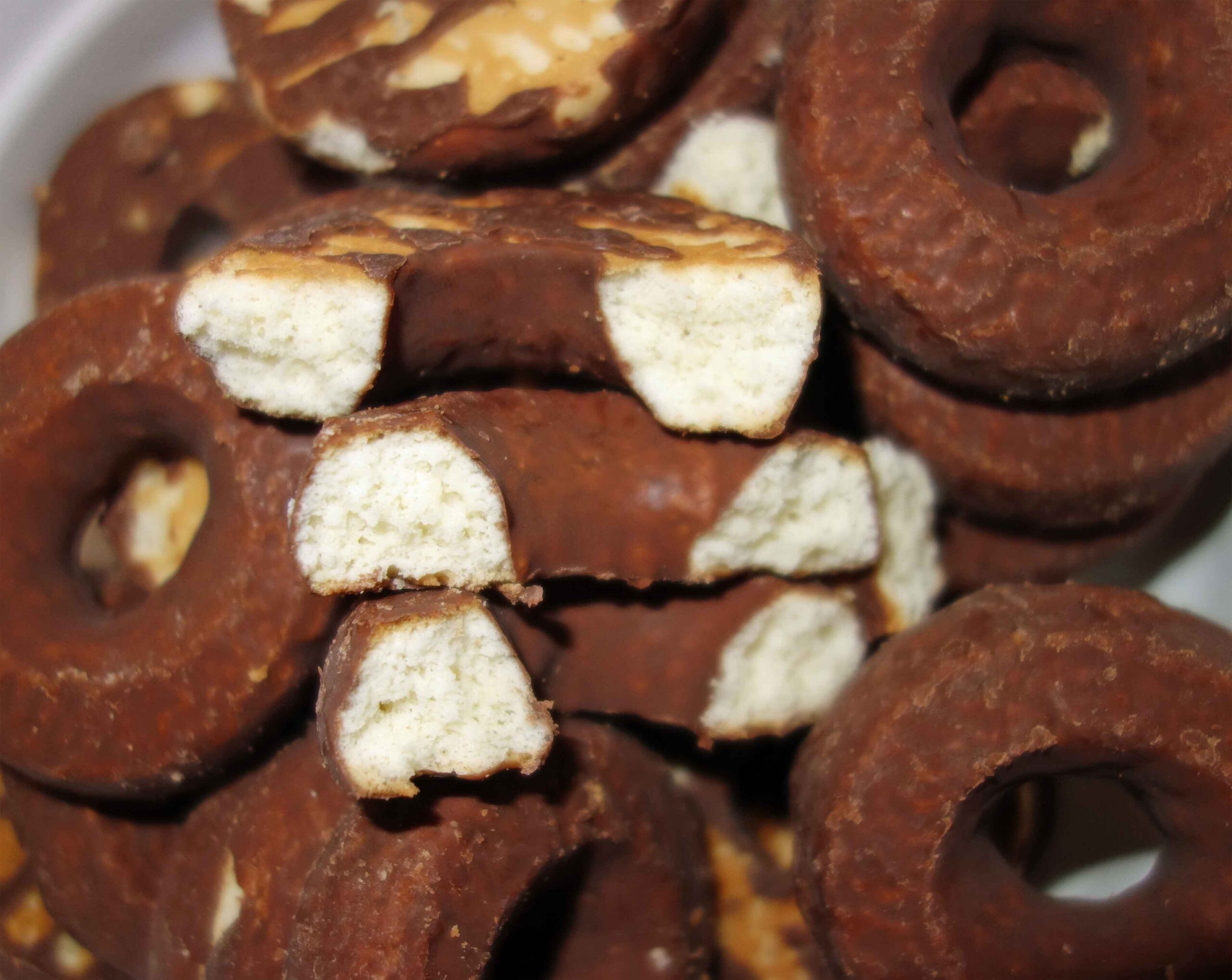 チョコレートでコーティングされたドーナツ型のクッキーを白い器に盛った写真