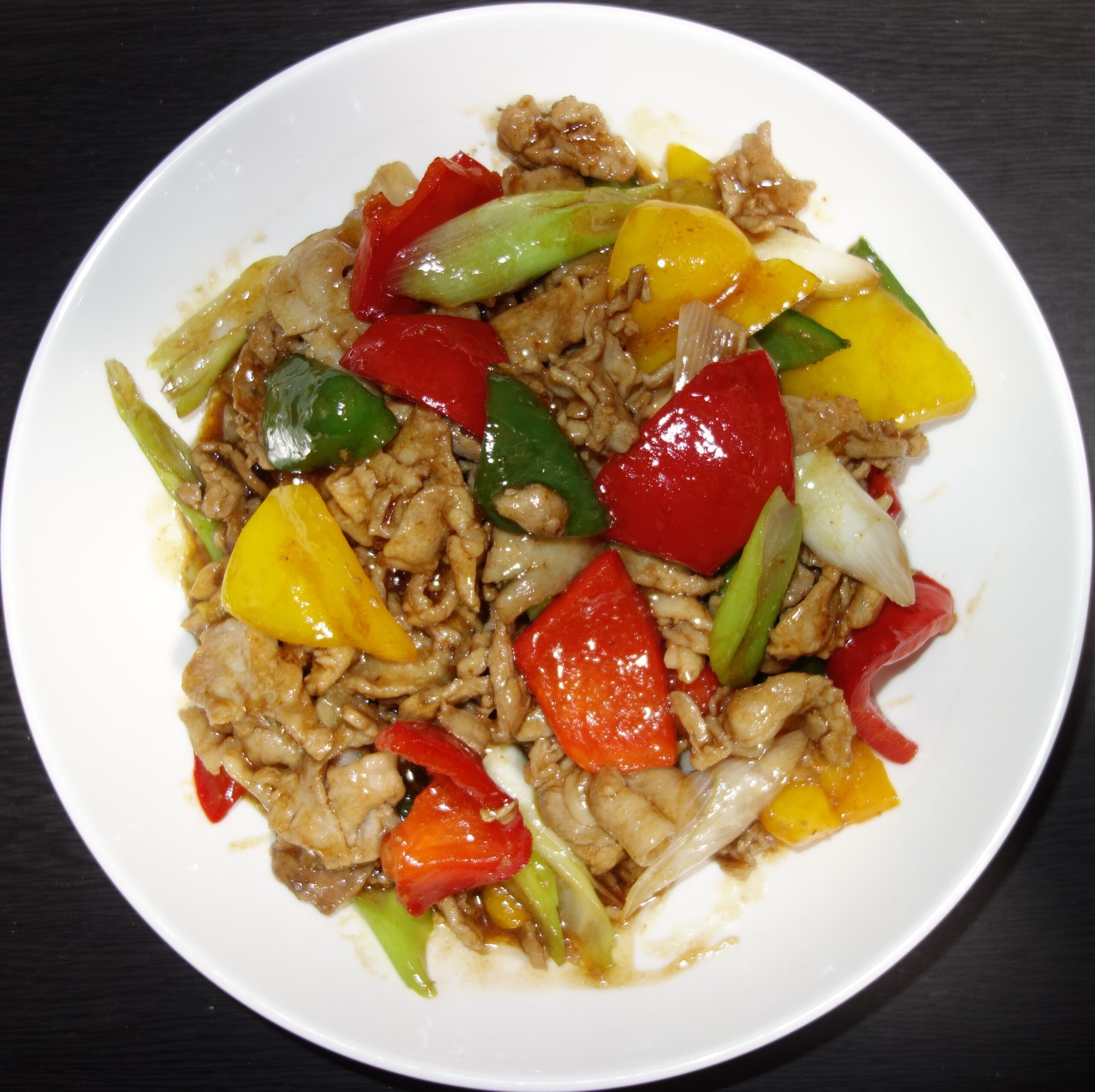豚肉と玉ねぎの黒酢炒めは、玉ねぎの甘みと豚肉の旨味が組み合わさり、食欲をそそる香りが特徴です。