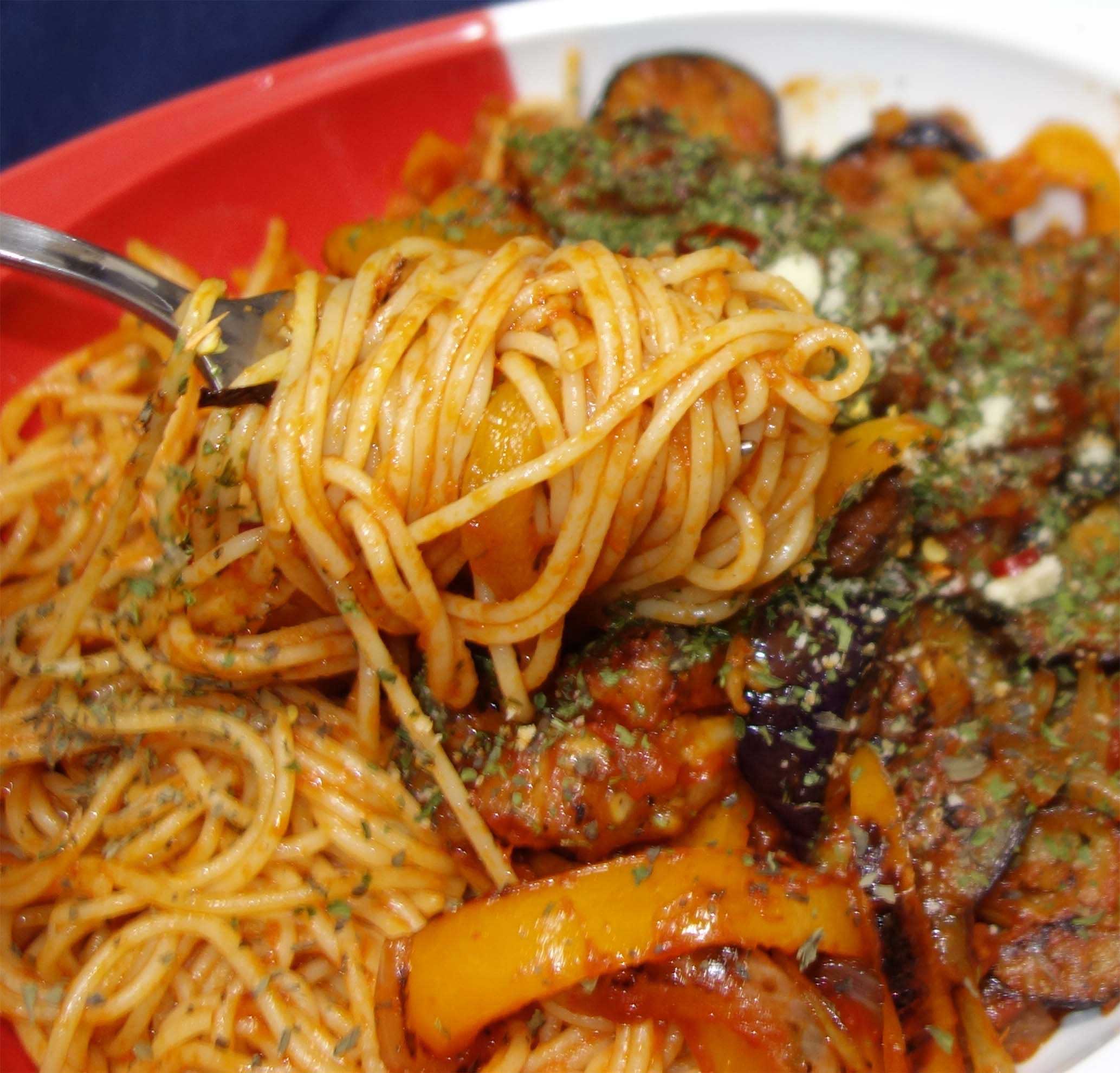 フォークで持ち上げられたナスとピーマンのトマトソーススパゲッティ