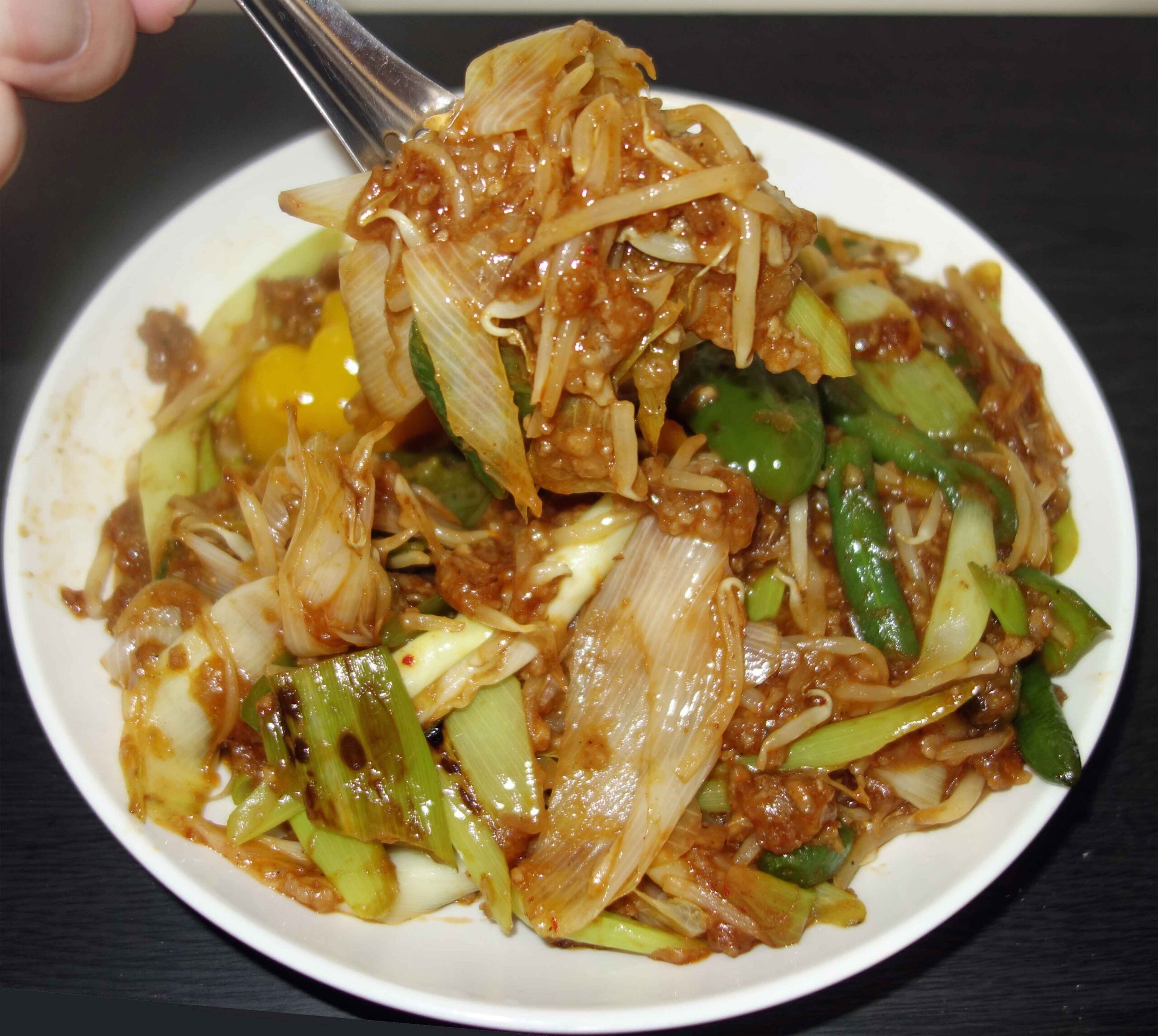 ラー油のピリ辛な刺激が、こってりとした炒め物にさらなるアクセントを加えます。
