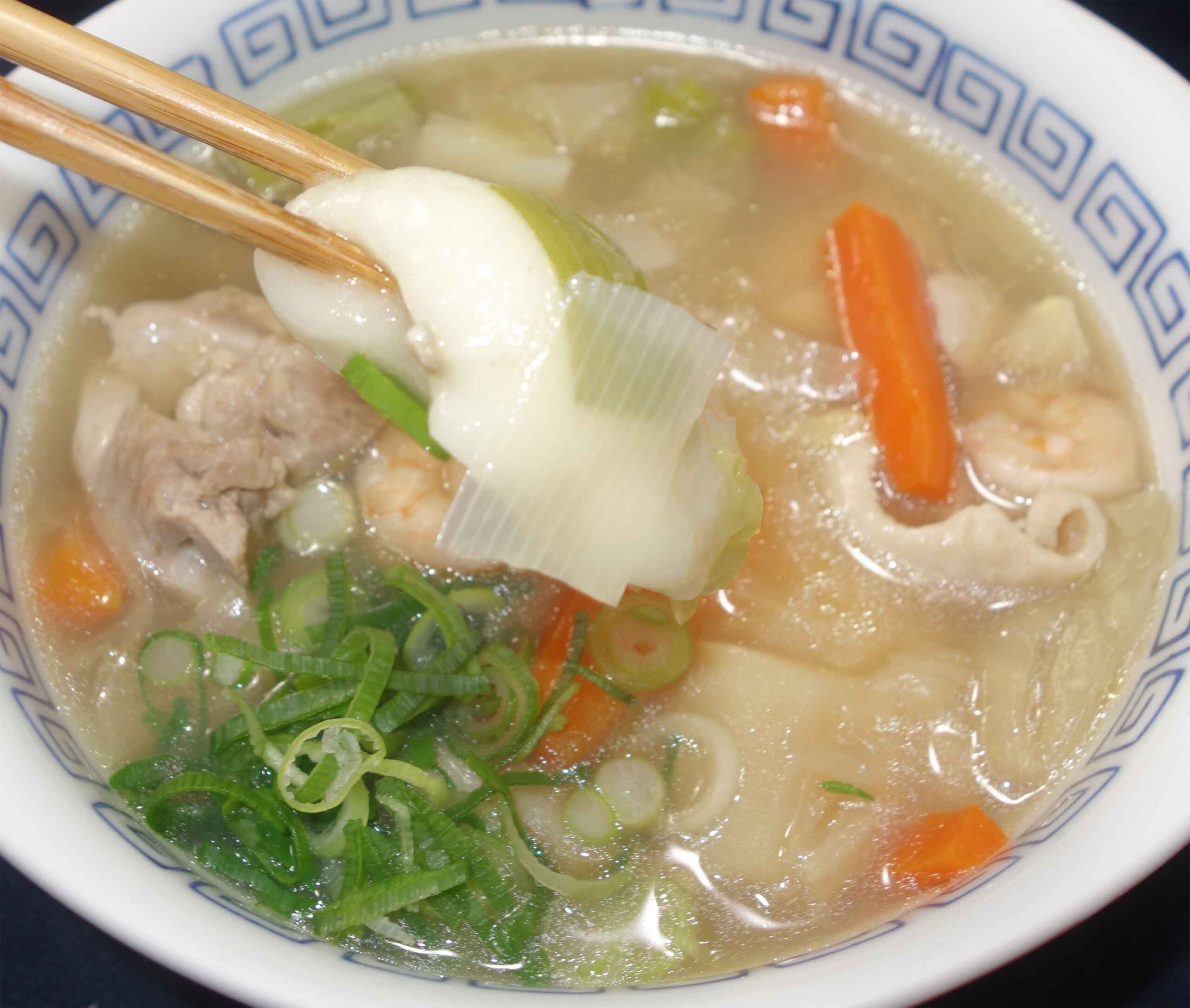 豚肉雑煮は、昆布出汁に豚バラ肉を加えてコクを出し、白菜やえのき、大根などを加えます。